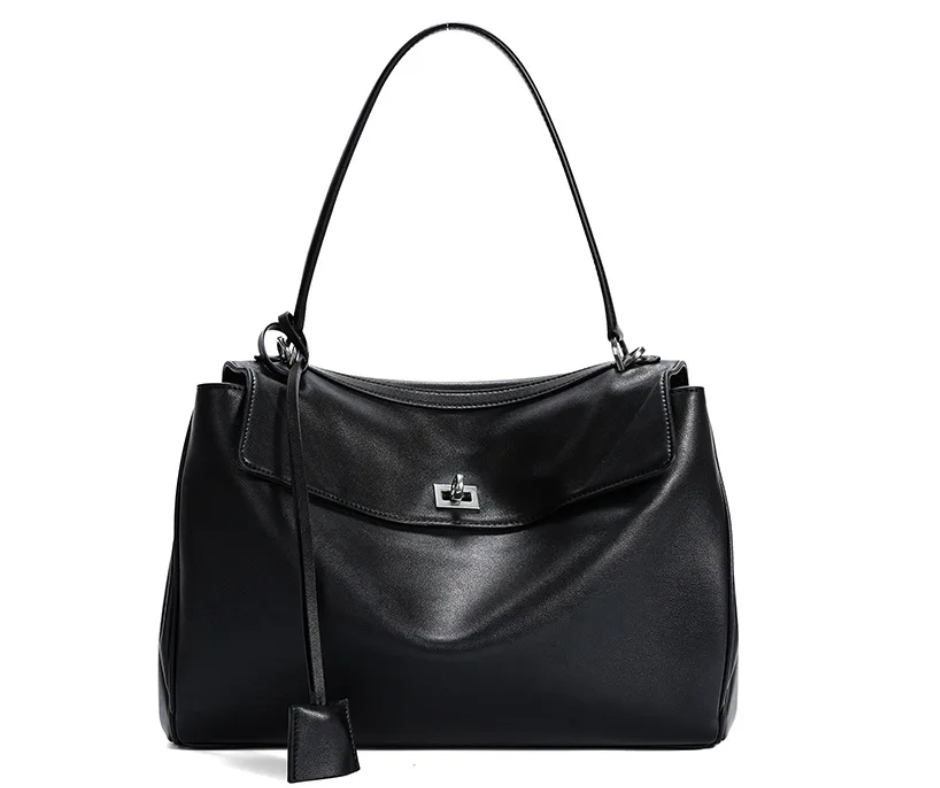 Diese schwarze Schultertasche vereint klassische Eleganz mit modernem Design. Die edle, glatte Oberfläche verleiht ihr einen luxuriösen Look, während die goldenen Metallelemente wie der stilvolle Drehverschluss und die dezenten Beschläge für einen Hauch von Raffinesse sorgen.