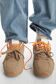 - Unterschiedliche Schleifen: Ein besonderes Markenzeichen dieser Sneakers sind die zwei unterschiedlichen Schleifen – eine braune und eine orangefarbene – die dem Design eine einzigartige und stilvolle Note verleihen.