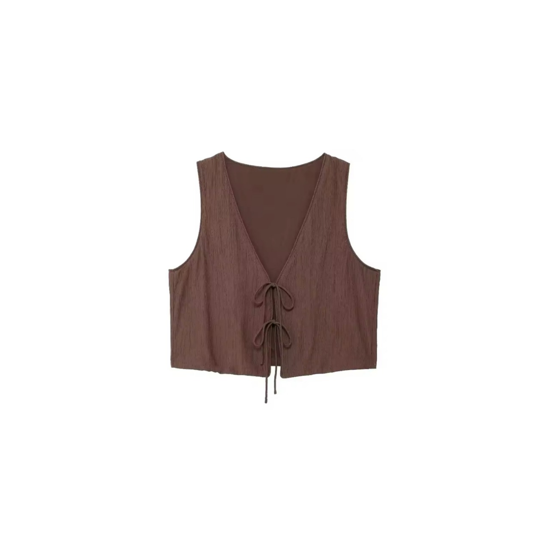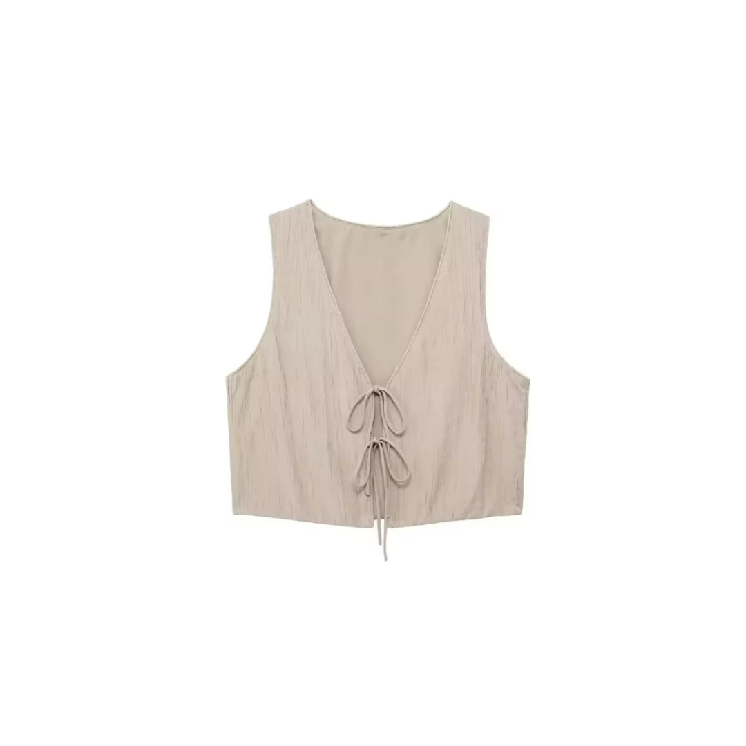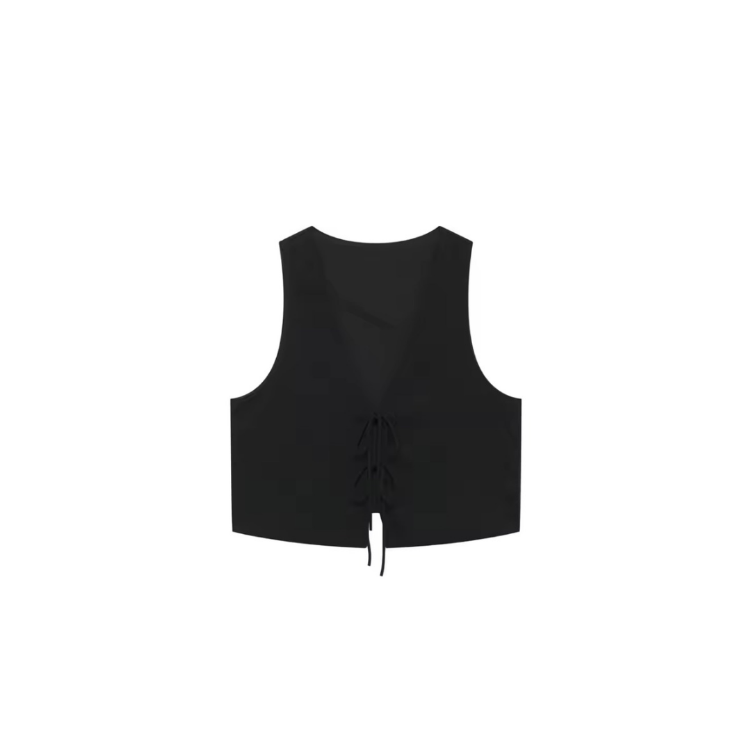 - Oberteil: Ärmelloses Crop-Top mit tiefem V-Ausschnitt und zwei Bindebändern an der Vorderseite